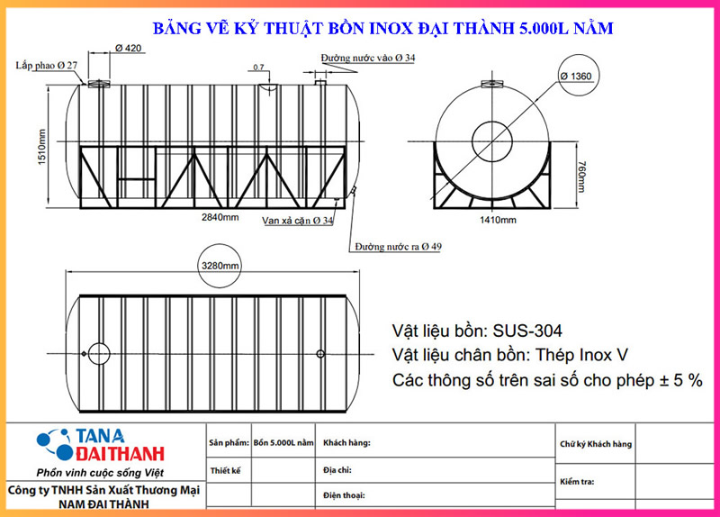 BẢNG VẼ KỶ THUẬT BỒN NƯỚC INOX 5000L NGANG ĐẠI THÀNH