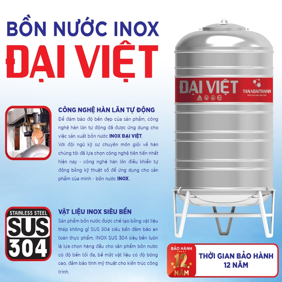 – Sản phẩm bồn nước inox Đại Việt được bảo hành lên đến 12 năm