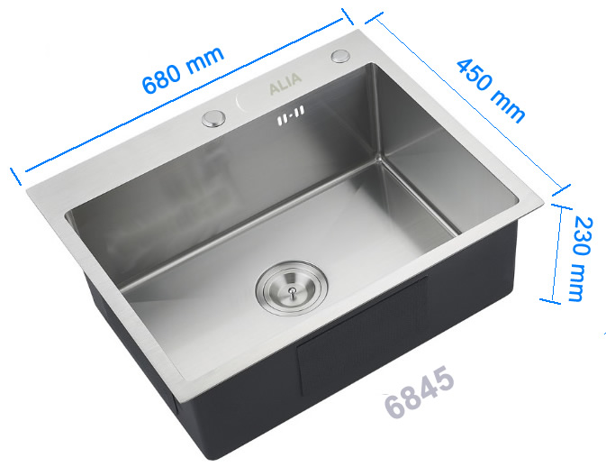 Kích thước chậu inox 304 1 hộc 6845 có kích thước như sau: