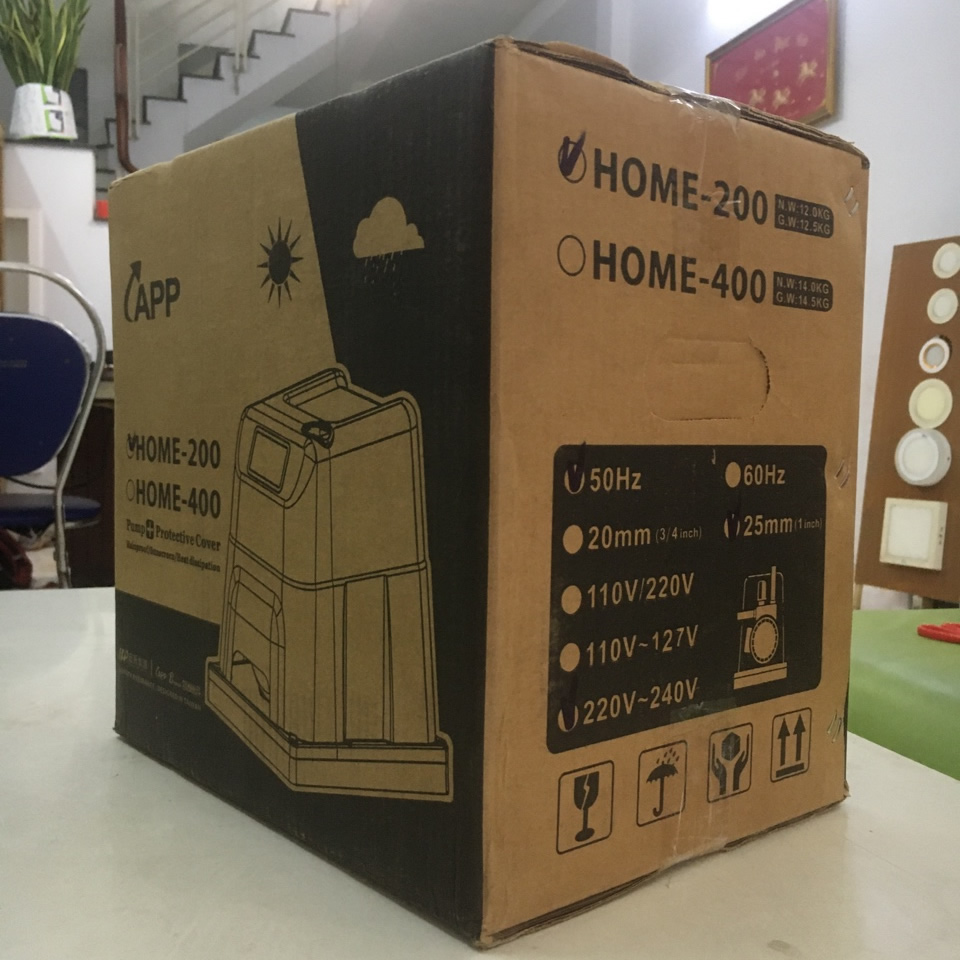 – Máy bơm APP Home-200 200w có chụp thùng vỏ ngoài bằng nhựa dùng che nắng mưa