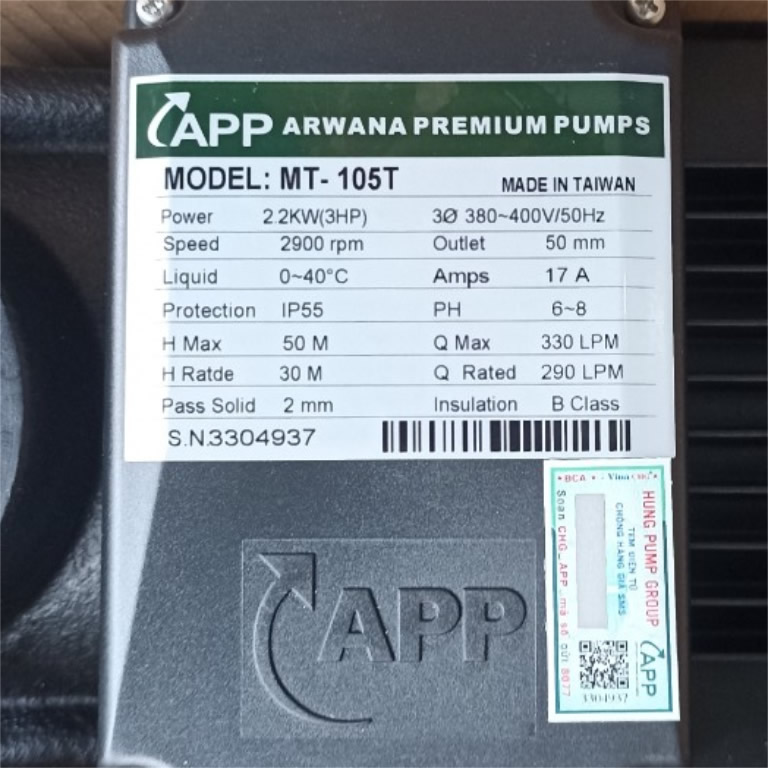 – Mỗi sản phẩm Máy bơm APP MT-85T 3HP đều có kèm theo phiếu bảo hành.
