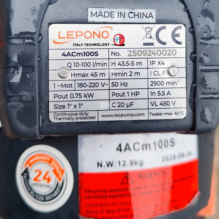 – Máy bơm Lepono 4ACm100S điện 220v, dòng bơm nước đẩy cao, đa tầng cánh 1Hp.