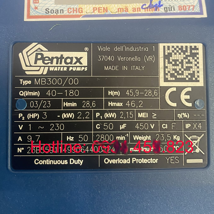 Máy Bơm Nước Pentax MB300/00 được nhập khẩu nguyên chiếc từ Italy với đầy đủ chứng nhận xuất xứ và chất lượng sản phẩm (CO, CQ).