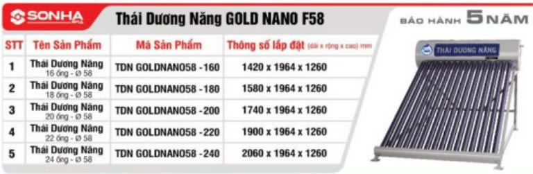 Thông số kỷ thuật Máy nước nóng năng lượng mặt trời Sơn Hà Gold Nano