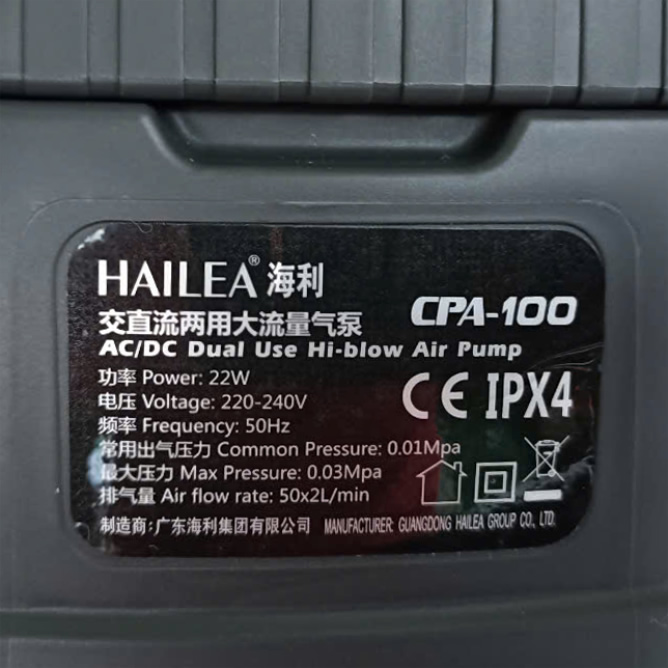 – Máy thổi oxy tích điện HAILEA CPA100 dòng sủi oxy cho hồ cá cảnh nhỏ và trung bình.