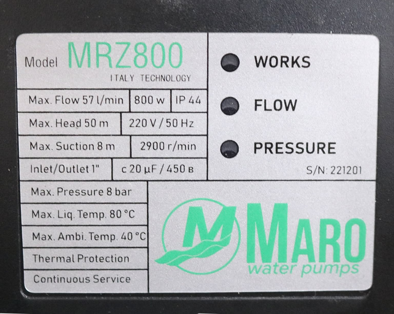 Thông số kỷ thuật Máy Bơm nước Maro MRZ-800