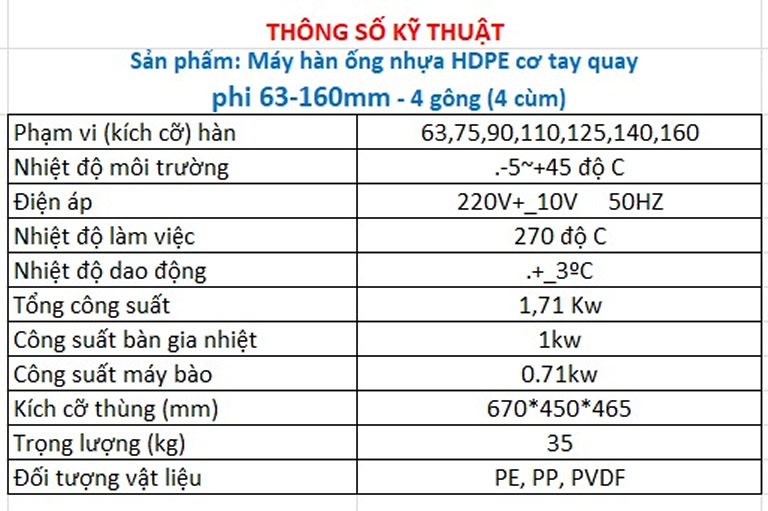 – Hàn được ống có kích cỡ : Ø63, Ø75, Ø90, Ø110,Ø125, Ø140, Ø160)