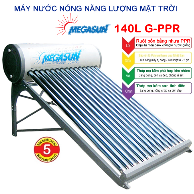– Máy năng lượng mặt trời Megasun 140L G-PPR Dung tích sử dụng 140 lít